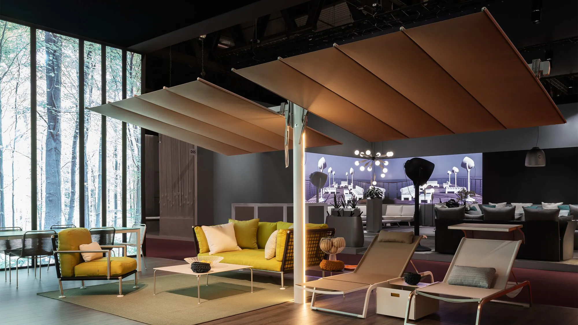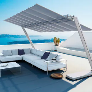 - Produktsortimentet omfattar parasoller i olika storlekar och takmaterial. Dessa parasoller är anslutna till en sidostång, har ett enkelt öppningssystem samt en lutnings- och vridmekanism.